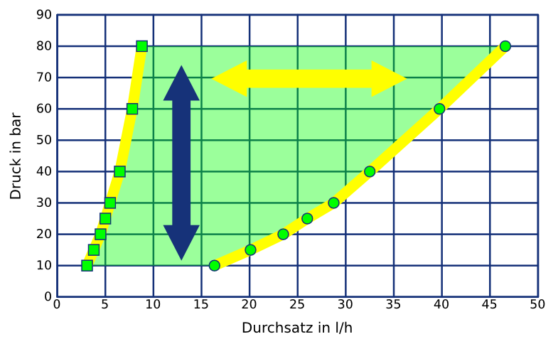 Die dargestellte Charakteristik zeigt einen möglichen Betriebsbereich einer regelbaren Düse. Mit einer gewählten inneren Geometrie der Düse (Bohrungsplatte und Drallkammer) können die Betriebspunkte in der farbig gekennzeichneten Fläche angesteuert werden. Zur Einstellung des Betriebspunktes ist nur eine Armatur notwendig. Durch sie wird der Durchsatz eingestellt und durch die Pumpe der Druck festgelegt.